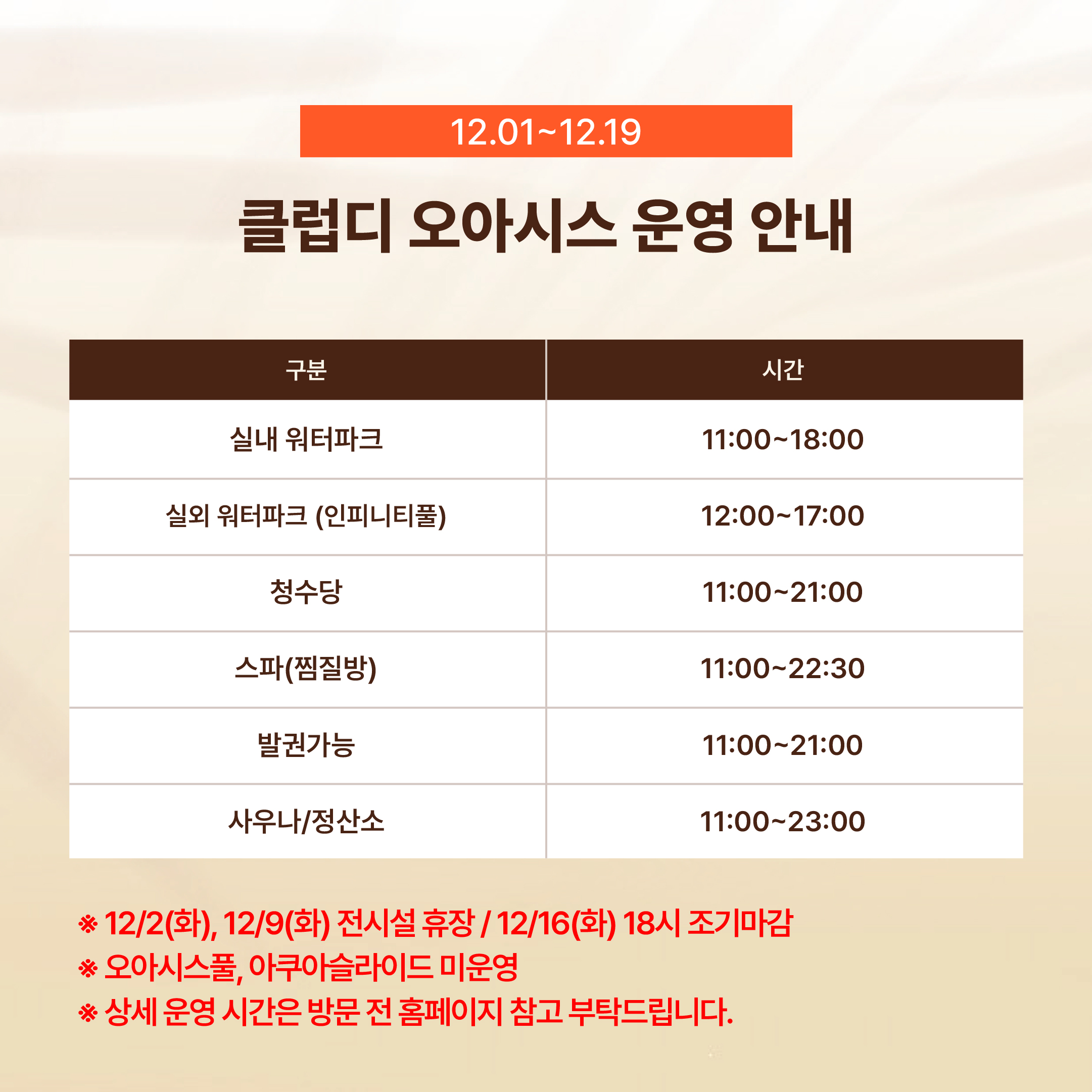 인피니티풀, 오아시스풀(키즈풀), 아쿠아슬라이드, 유수풀