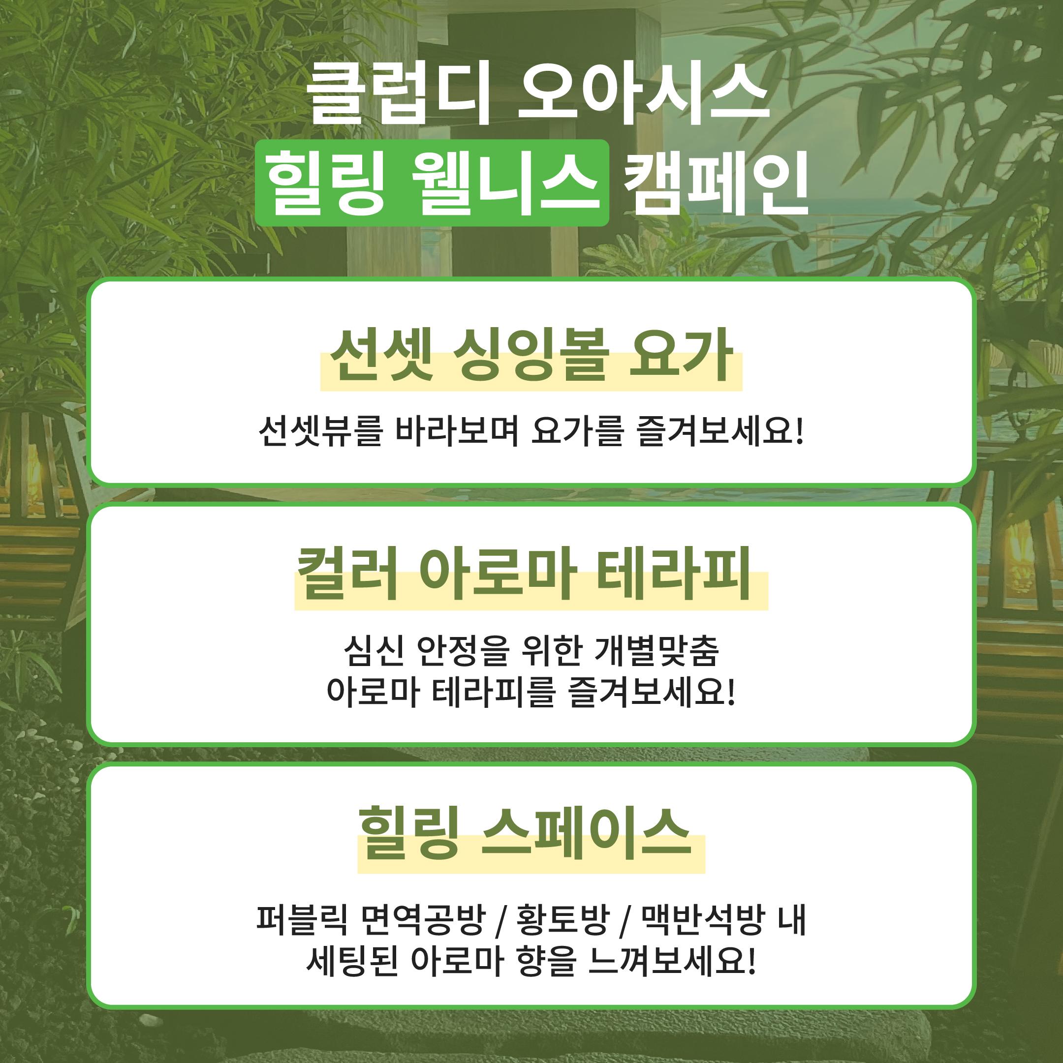 웰니스(Well-ness) 와 클럽디 오아시스의 합성어로 사랑하는 사람들과 함께하는 클럽디 오아시스에서의 건강한 시간을 의미합니다. 클럽디 오아시스에서 제공하는 다양한 therapy를 통해 차별화된 휴식을 즐겨보세요.